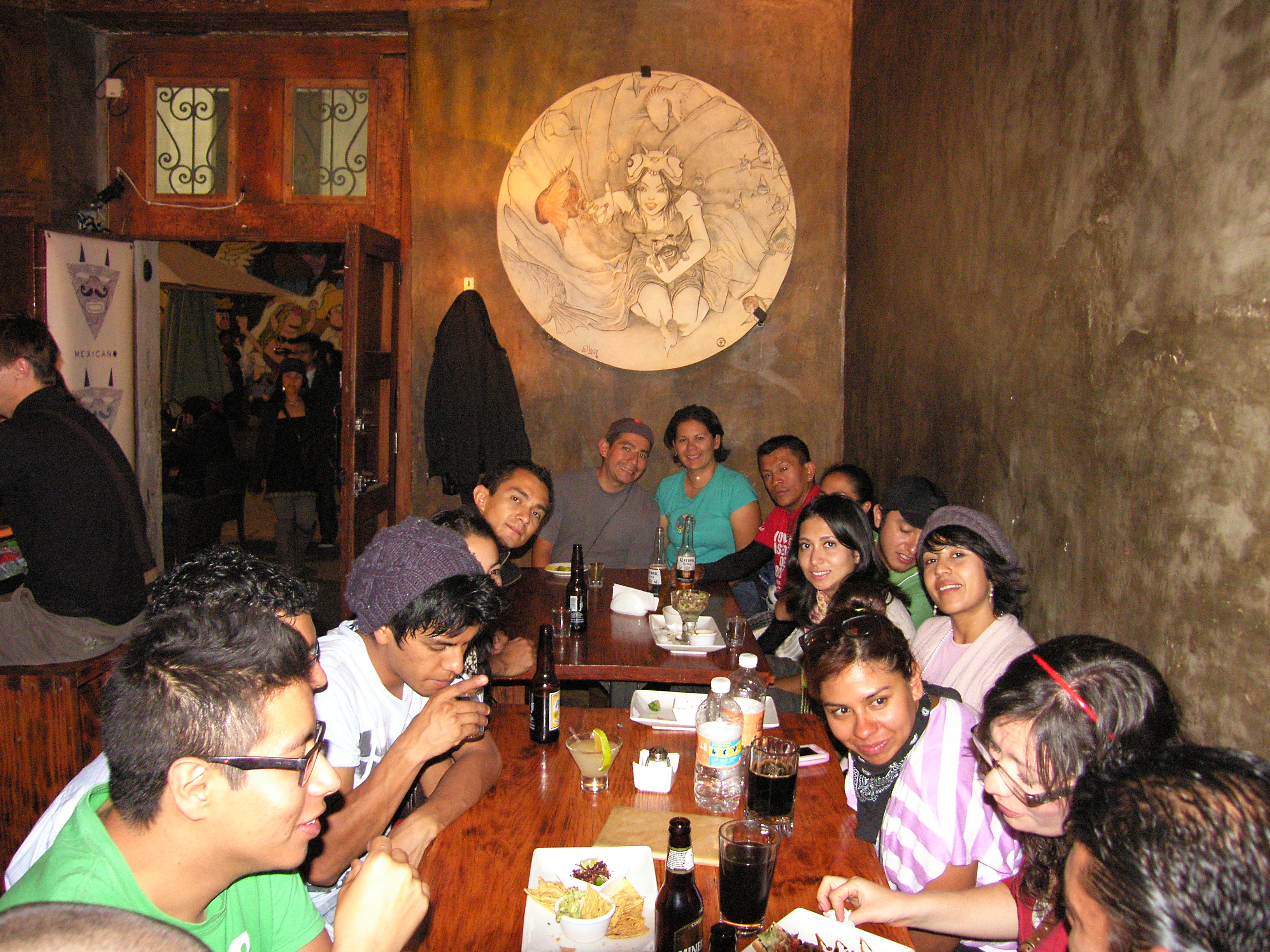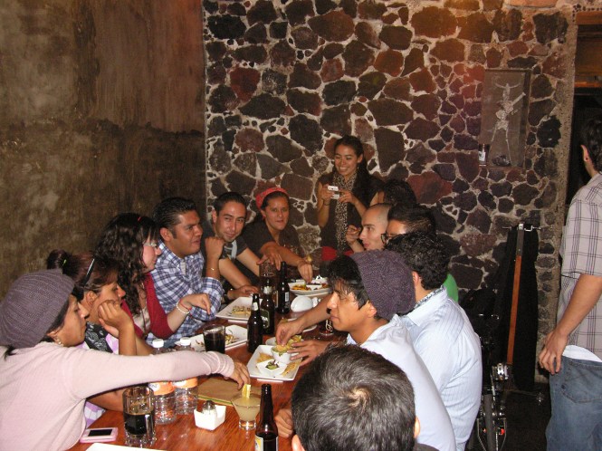 Ya que terminamos, nos dirigimos hacia las pizzas, otros compañeros divisionarios se nos unieron y rodamos juntos hacia Medellín e Insurgentes, nos encontramos con un lindo mensaje de bienvenida en el pizarrón del menú, la masa ya estaba preparada y sólo faltaba que decidiéramos los ingredientes para que comenzaran a meterlas al horno de leña. Teníamos tanta hambre y estaban tan crujientes que comenzamos a pedir pizzas y mas pizzas para probar de todas las combinaciones posibles: napolitana, fugazzeta, pepperoni con champiñones, margarita, vegetariana, entre otras. Al final, tuvimos una muy deliciosa sorpresa, los chicos de Pizzas La Barra nos prepararon una pizza dulce a base de kahlua, cajeta, plátano frito, arándano, nuez, bañada en una vinagreta de frutos rojos, a pesar de que varios ya estábamos más que satisfechos, se veía tan rico que le abrimos un lugar en nuestro estómago para probar la sorpresa.